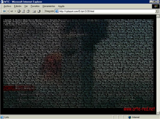 2002 Eryk Salvaggio – September 11th 2001 3 Published 9 marzo, 2016 at 800 × 600 in 2002 ← Anterior Siguiente → «THE WARTIME PROJECT» – «September 11th, 2001» de Eryk Salvaggio.