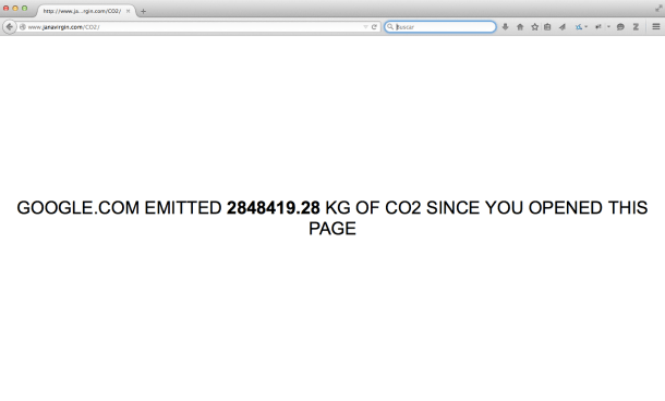 “En realidad no tenía muy claro por dónde empezar y comencé a investigar la cantidad de kilovatio-hora (Kwh.) que se necesita para cargar la información en la red. Obviamente este proceso se traduce en emisiones de dióxido de carbono (CO2), y me pregunté cómo es posible que una conexión tan obvia estuviera tan desdibujada en la imaginación social. Calcular las emisiones exactas generadas por las comunicaciones en la red es extremadamente difícil debido a la gran cantidad de actores participantes en el proceso, entonces CO2GLE nació con la idea de hacer visible la materialidad de lo virtual y resaltar esa conexión”, concluye Moll que actualmente está desarrollando un plugin para navegadores, que permitirá calcular en tiempo real las emisiones aproximadas que un usuario genera al navegar por la red.