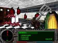 El monitor muestra inusuales representaciones iconográficas. El público se encuentra en un entorno tridimensional, donde se desplaza con el ratón. Se trata de Sod, la reelaboración de Jodi del código de Spear of Destiny, secuela de Wolfenstein 3-D, un videojuego precursor de Doom, Marathon y Quake, juegos míticos de los años noventa.
